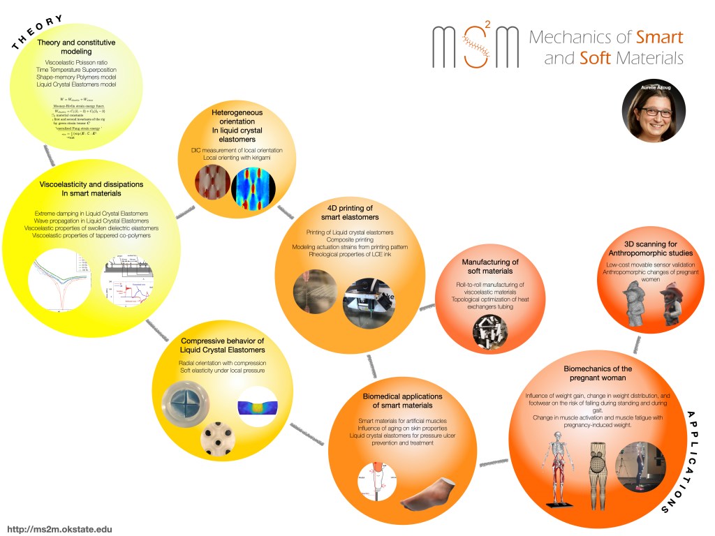 The MS2M = Mechanics of Smart and Soft Materials Lab focuses the fundamental understanding of the formation, deformation, dissipations, and evolution mechanisms of smart elastomers and soft tissues. This understanding will emerge from the combination of targeted experimental measurements at multiple scales and corresponding simulation approaches. The research focuses on areas of engineering where the mechanics of a soft material largely impacts the ultimate behavior of the system. We are particularly interested in the time-dependent mechanical behavior of liquid crystal elastomers, their damping abilities, and their use for bioengineering applications. We also aim to define interventions to mitigate the high risk of falling during pregnancy, using musculoskeletal modeling of the pregnant body and gait measurements.